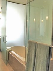 Enjoy your own private spa in your master suite. The south and west walls of the master bath are frosted glass, bathing the bathroom in natural light from the window wall.