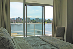 The south wall of the master suite is a floor-to-ceiling window facing Victoria Harbour. A sliding glass door leads to the curving, glass panel balcony. Window coverings incude rolling blinds that reduce the sun's glare and provide privacy while preserving the view, and blackout curtains to help you sleep in.