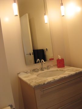 The powder room offers an elegant facility outside the bedroom ensuites, preserving the privacy of the occupants. It includes stylish marble floor tiles and sink surround and a floating cabinet.